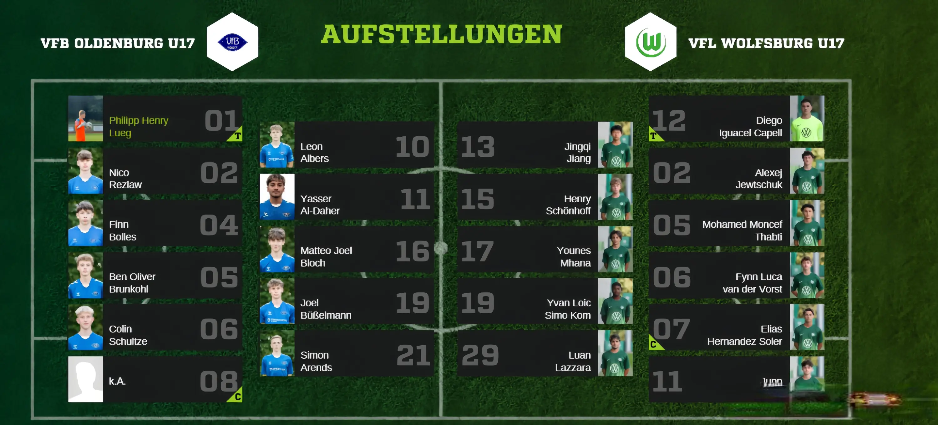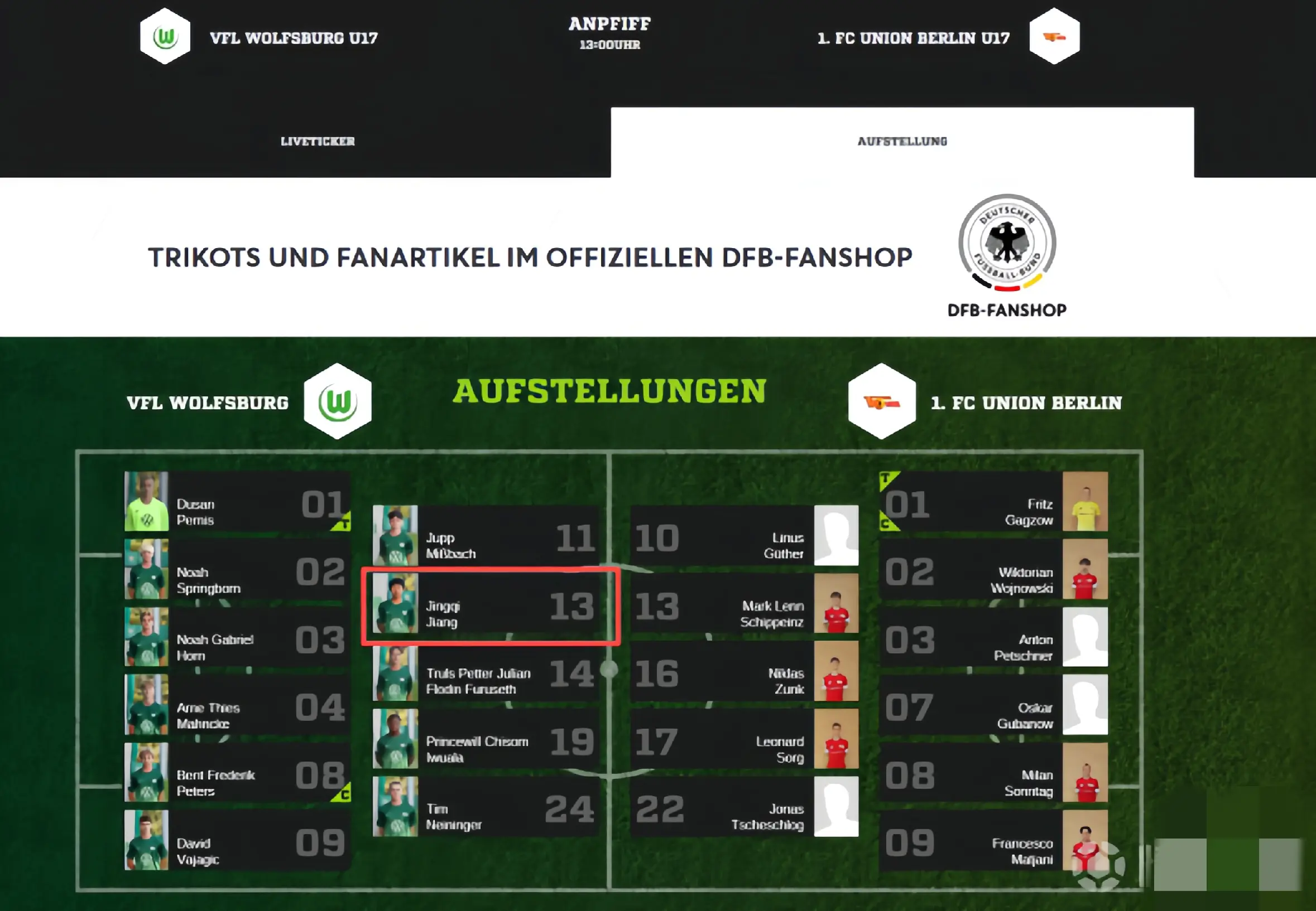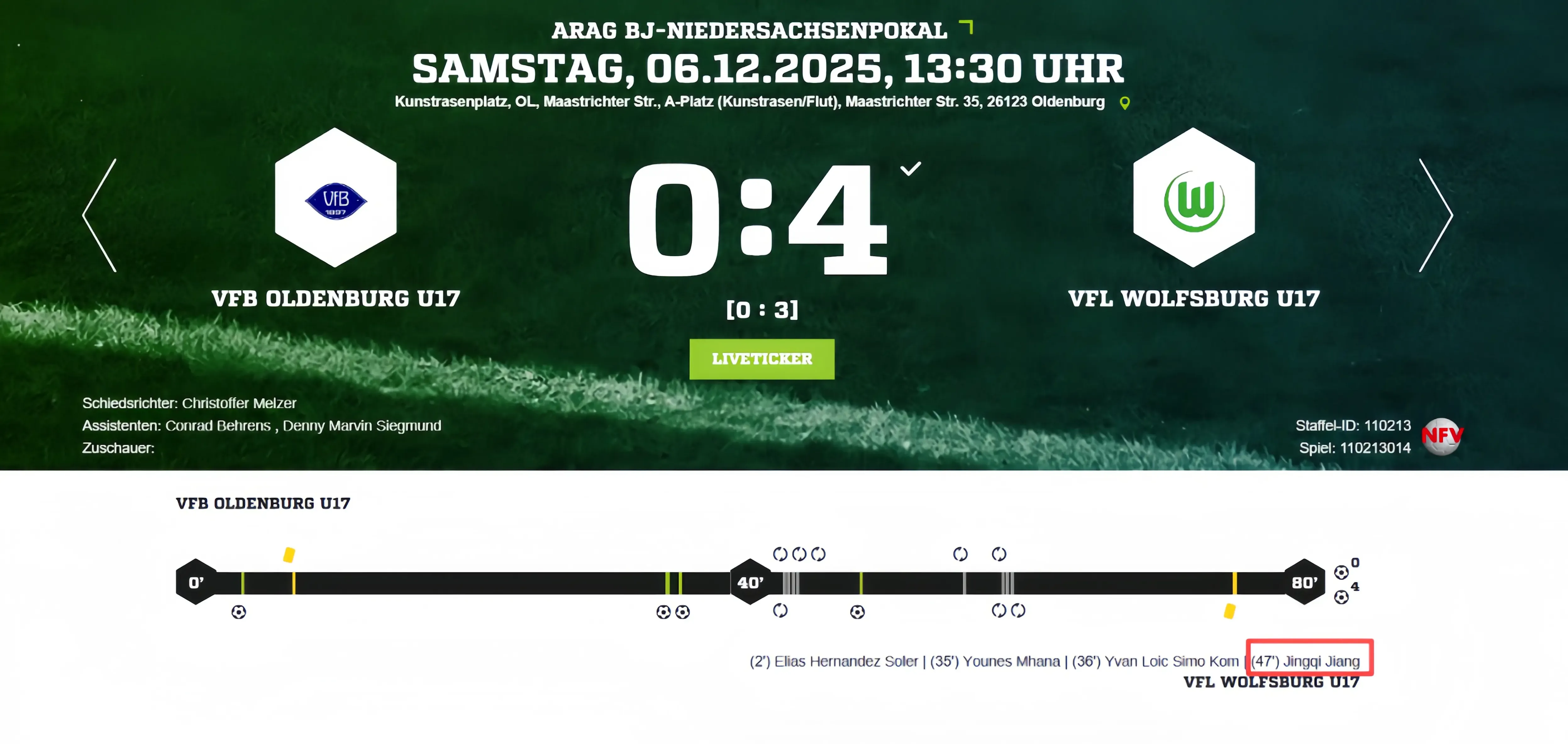 11月9日德国U17一级(顶级)联赛,进行第11轮比赛,德甲沃尔夫斯堡U17A队2比1战胜德甲柏林联合U17A队。中国16岁小将姜景祺担任主力后腰首发出场,第73分钟姜景祺被队友换下。本场比赛,姜景祺在防守端表现出色,赛后获得好评。