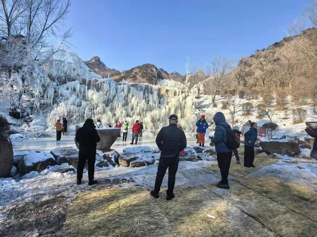 在桃花溪谷景区,冬日冰瀑景观十分抢眼:层层叠叠的冰柱从山体垂落,晶莹剔透的冰帘在蓝天映衬下显得格外壮观,冰瀑周边的树枝挂满雾凇。游客们纷纷驻足观赏、拍照。来自鞍山孙宝江志愿服务团队的乔萍说,他们是十几名团队成员结伴而来:“今天是新年第一天,大家相约来千山登高,也欣赏一下雪人节的美景。冰瀑银装素裹,特别漂亮,也欢迎全国各地的游客来千山打卡留念。”