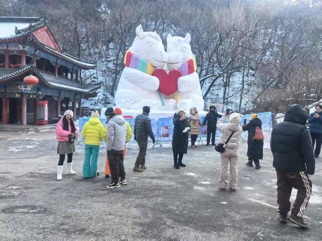 沿山路而上,一处双马造型雪雕吸引游客注意:两只有些萌动可爱的白马相拥,中间嵌着一颗醒目的红色爱心。名字也颇具美好寓意:马上脱单。“我得把它拍下来发给我闺女”……不少游客围着雪雕议论纷纷。