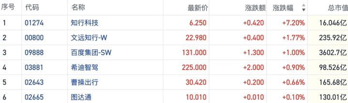 截至发稿,知行科技(01274.HK)涨逾7%,文远知行-W(00800.HK)涨近2%,百度(09888.HK)等相关个股纷纷跟涨。